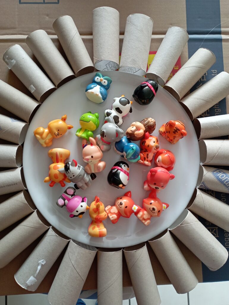 Dans chaque rouleau, j’ai glissé un petit animal en mousse.